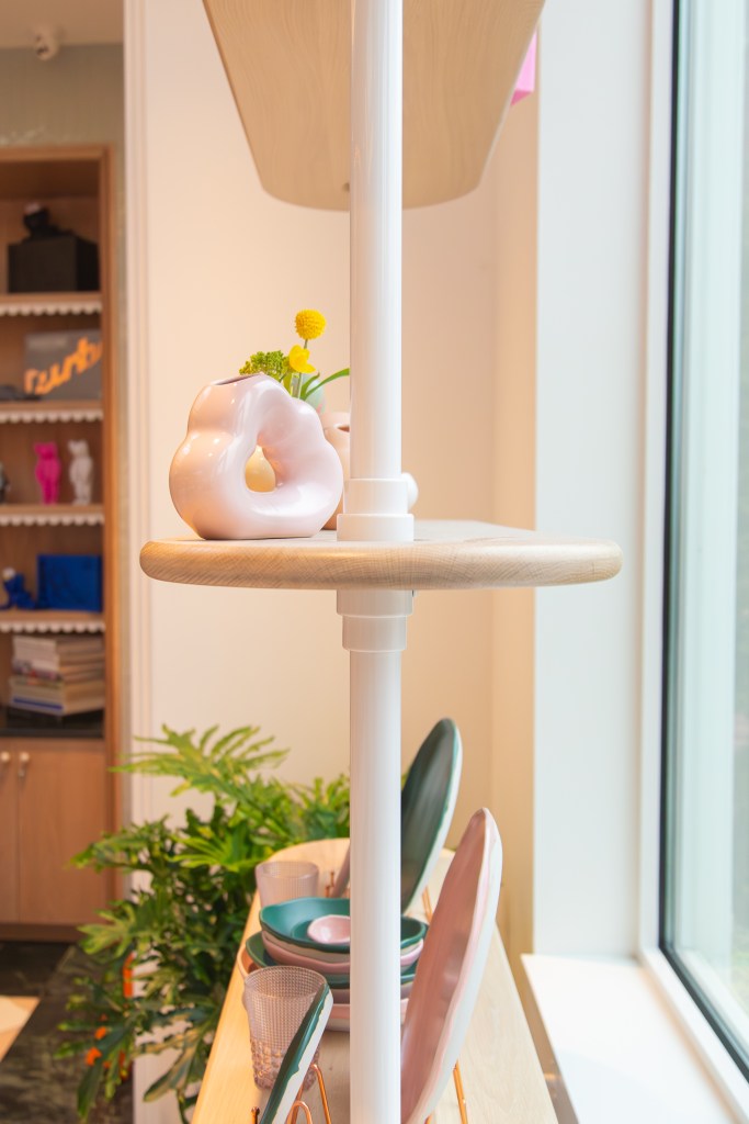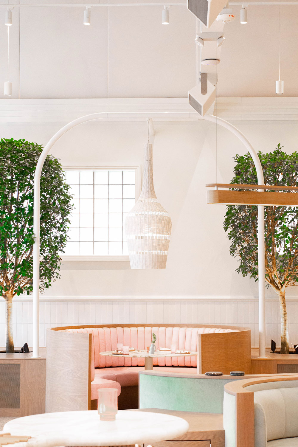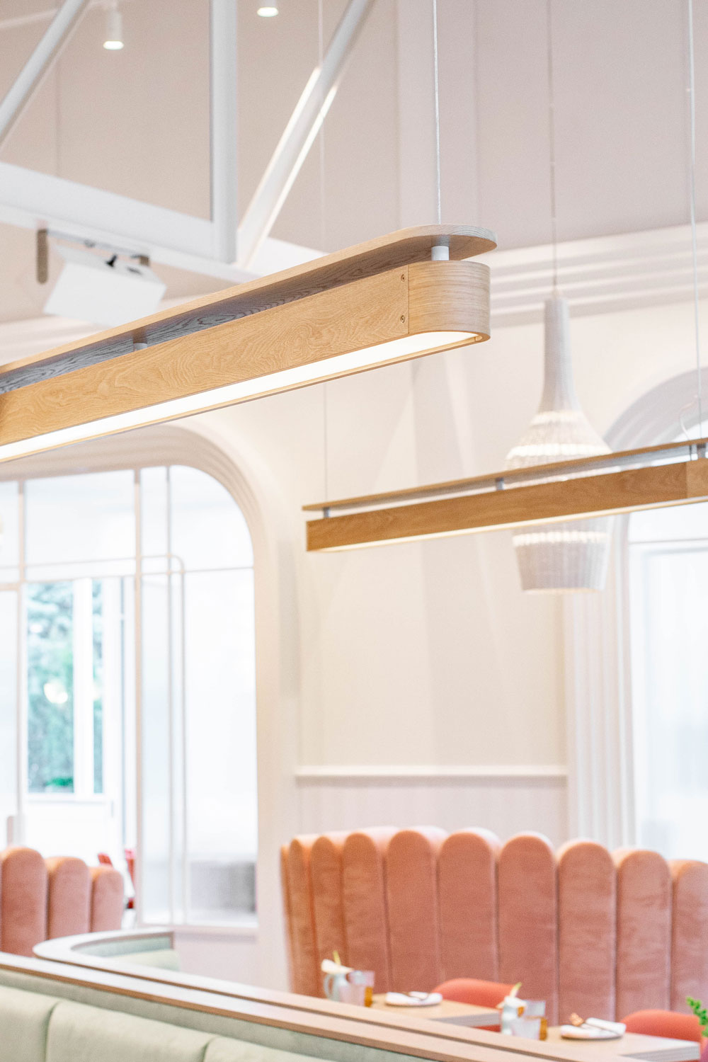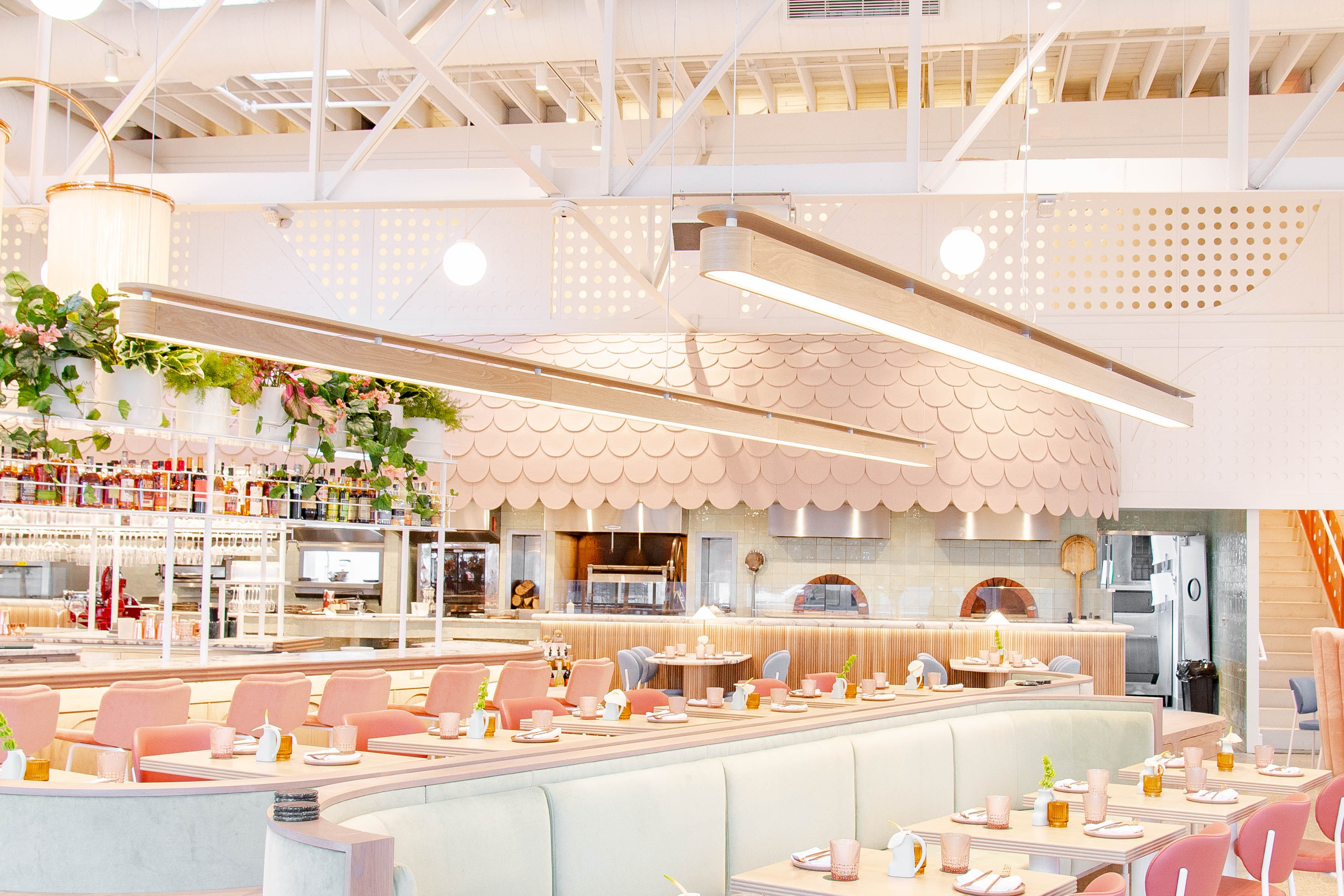These included ten foot high arches which would loom over the circular booths and support basket-like light fixtures, a series of LED linear pendants some pushing twenty feet in length, and a set of enormous floor to ceiling shelves.