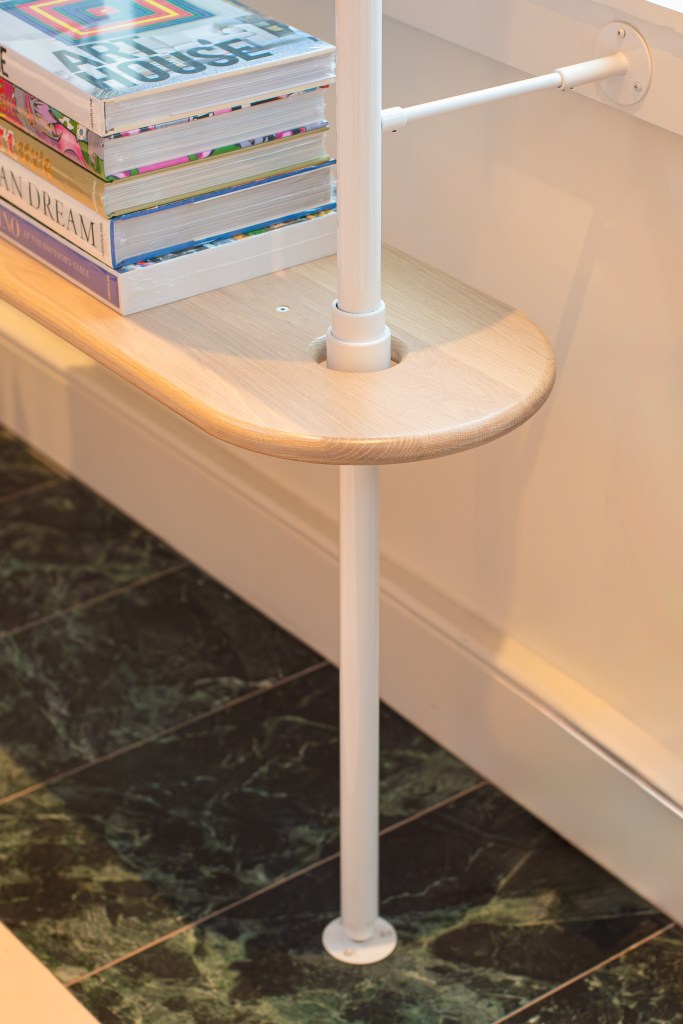 The shelves were the final addition to the space and perhaps one of the most impactful. We took inspiration from the rest of the space and saw an opportunity to push the design further. Our take includes 5-foot wide shelves of solid white oak pierced by the steel upright and supported on an inset bar. The effect is that of near- weightlessness creating an intriguing intersection of material and negative space. While it wasn’t the easiest path forward, we think it is a striking one that was worth the extra effort.